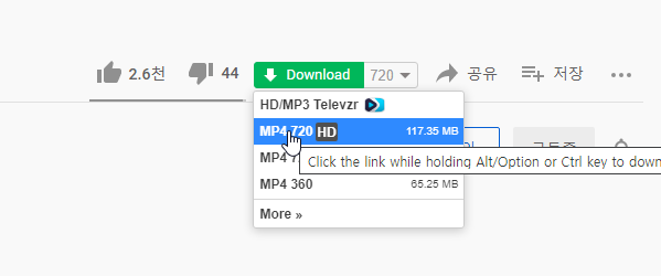 영상다운로드시 최상단의 MP4 720 HD의 경우 Alt키를 누른 상태에서 클릭후 다운로드 또는 Ctrl키 누른 상태에서 클릭시 새창으로 플레이어가 뜨고 마우스 우클릭후 다른이름으로 저장 가능합니다.