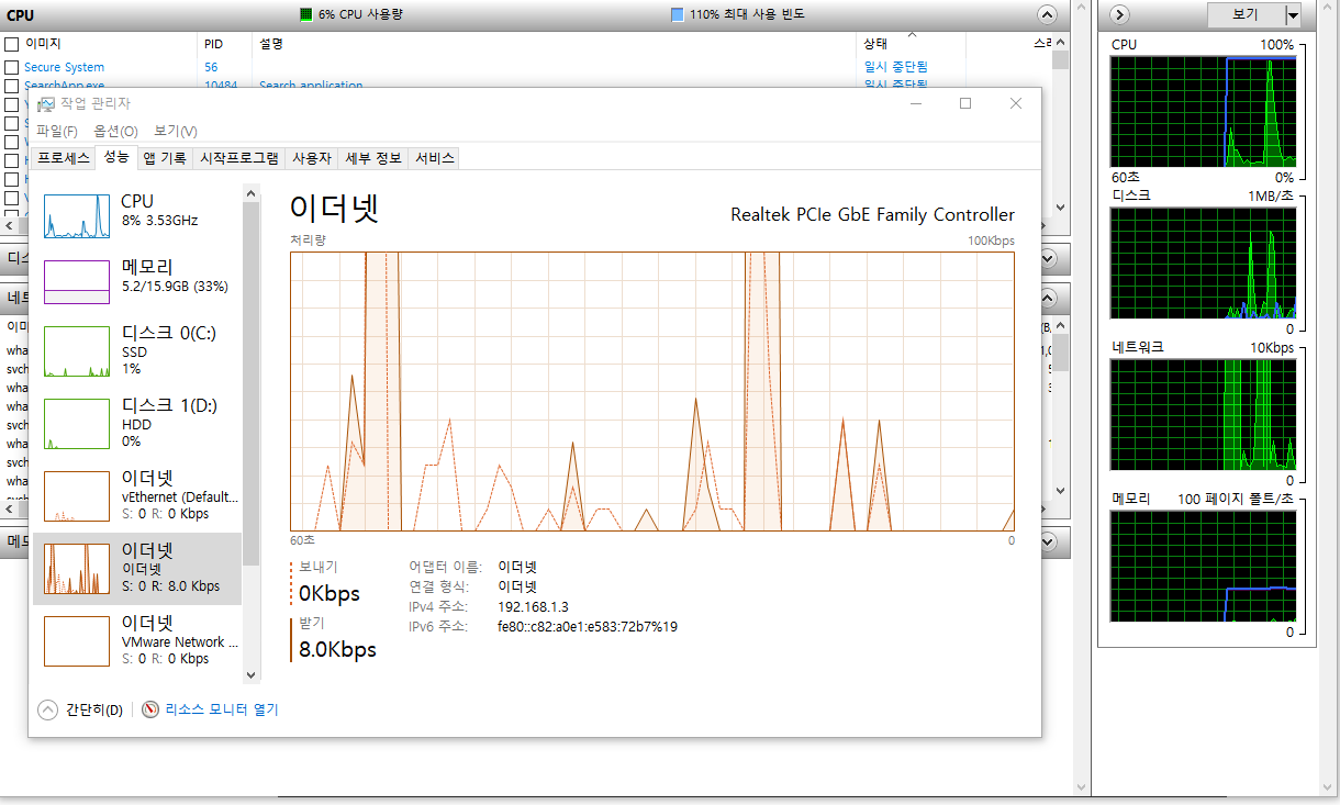 네트워크와 TCP 연결 수가 비정상적으로 높게 유지되고 있는 모습입니다.