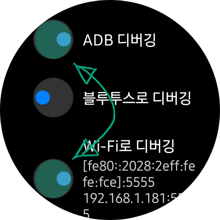 그리고 워치 설정메뉴 > 연결 > Wi-Fi 를 사용중으로 전환하고 개발자 옵션으로 접속하여