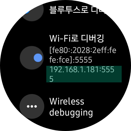 ★중요★ Wi-Fi로 디버깅을 활성화 하면 하단에 아이피주소와 포트가 표시됩니다. 해당 아이피주소와 포트를