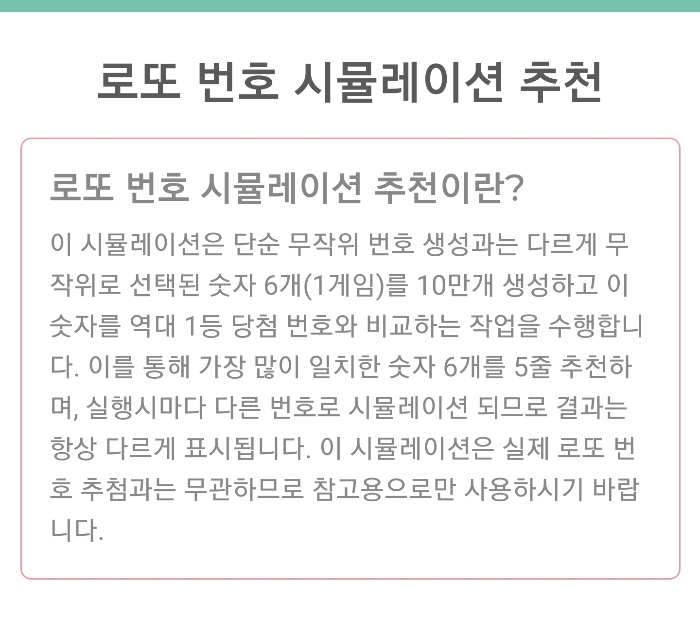 시뮬레이션 번호추천메뉴는 무작위로 추출한 로또 10만게임의 숫자들은 역대 1등 당첨번호와 비교하여 출현빈도가 높은 수들을 추출하여 그 숫자들을 다시 랜덤으로 추천해 주는 시스템입니다..