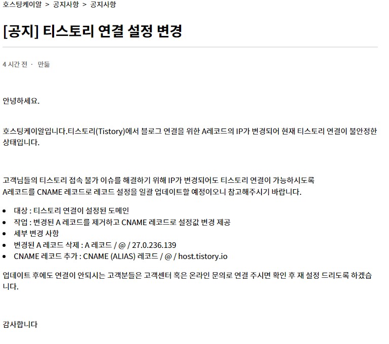티스토리측 문제인데 티스토리측에서는 아무런 응답도 없고 호스팅케이알측에서 A레코드를 CNAME으로 강제로