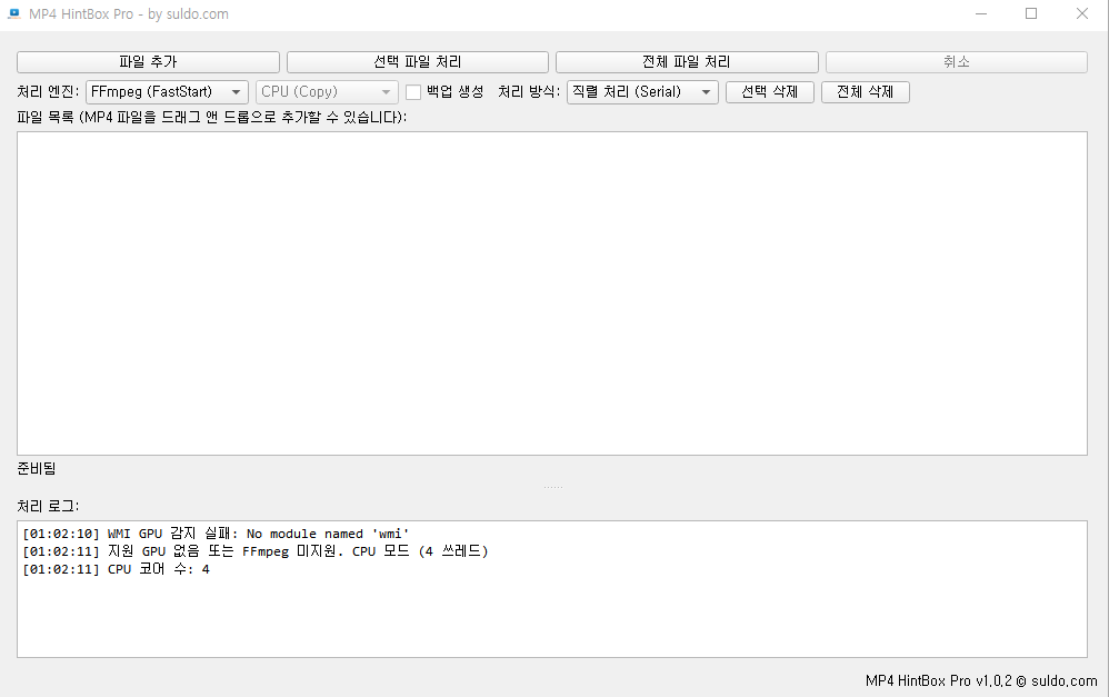 MP4 파일을 추가하면 자동으로 Faststart & Hint Track 처리를 해주는 툴입니다.