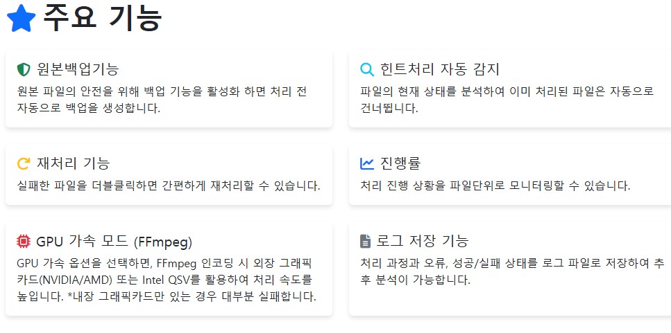 GPU 가속 모드 (FFmpeg) GPU 가속 옵션을 선택하면, FFmpeg 인코딩 시 외장 그래픽카드(NVIDIA/AMD) 또는 Intel QSV를 활용하여 처리 속도를 높입니다. *내장 그래픽카드만 있는 경우 대부분 실패합니다.