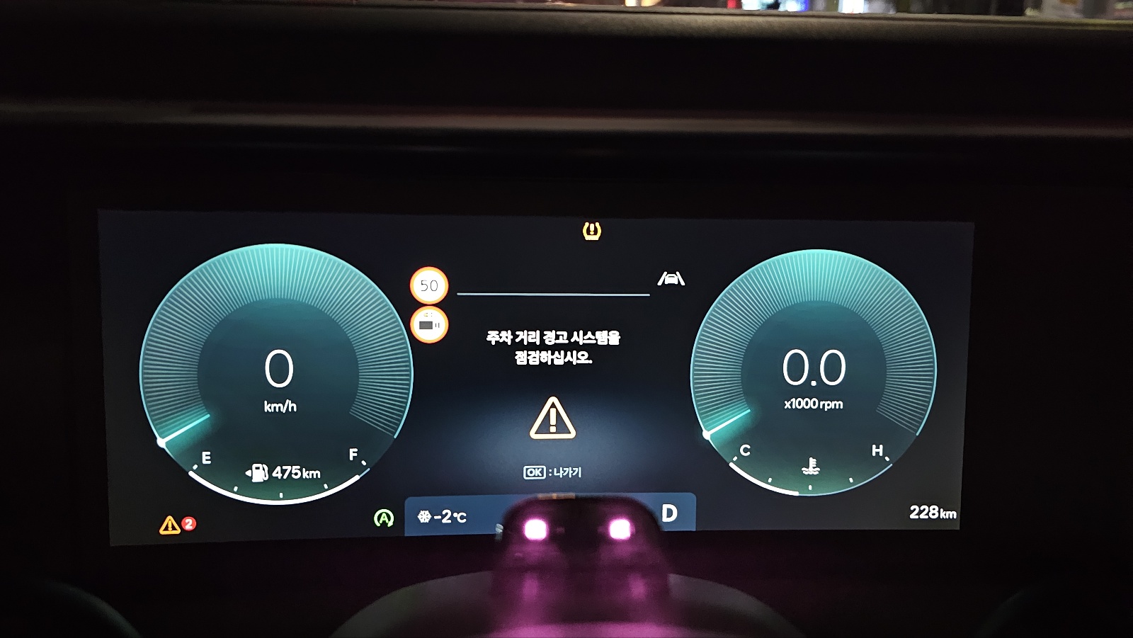 - 주행 중 스마트키 인식불가경고, 주차거리 경고시스템 경고등 점등, 전면 라이트 OFF 및 HUD 이상, 공기압 점검등 표시