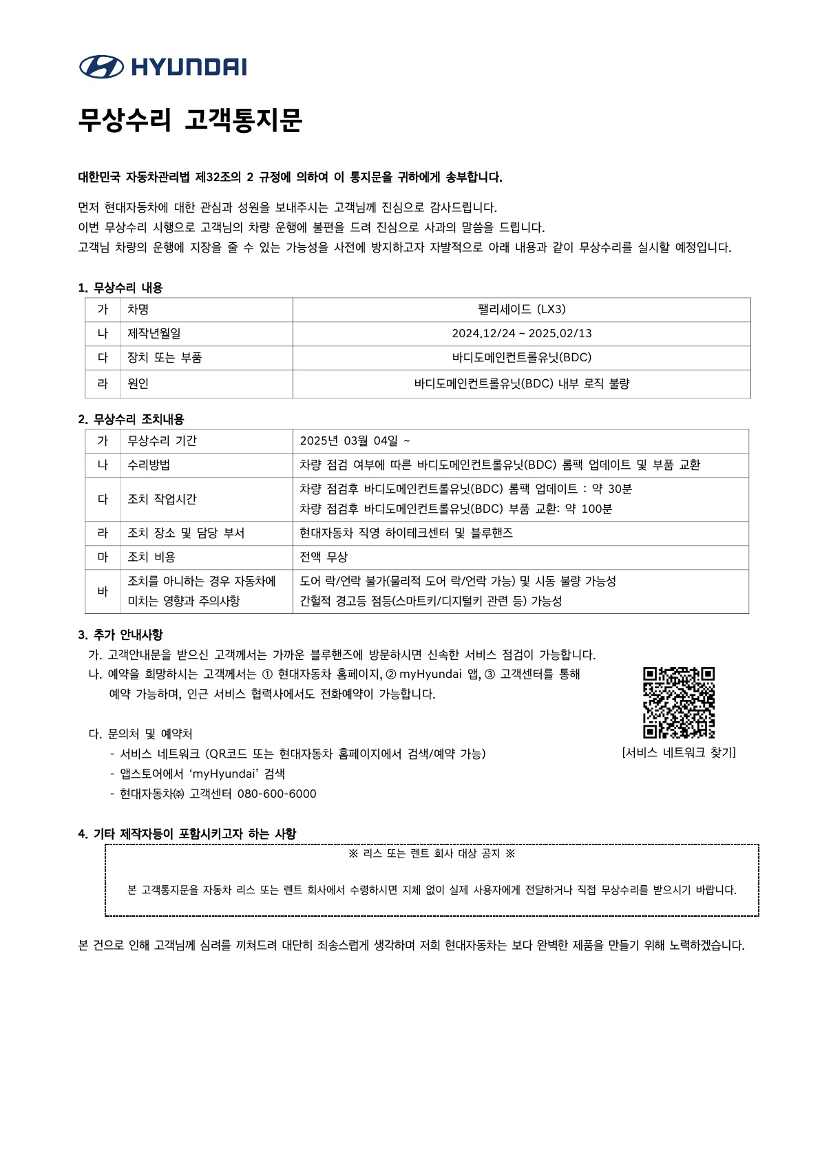 디올뉴팰리세이드(LX3) 시동불가 결함 및 블루핸즈 입고 과정과 진행상황