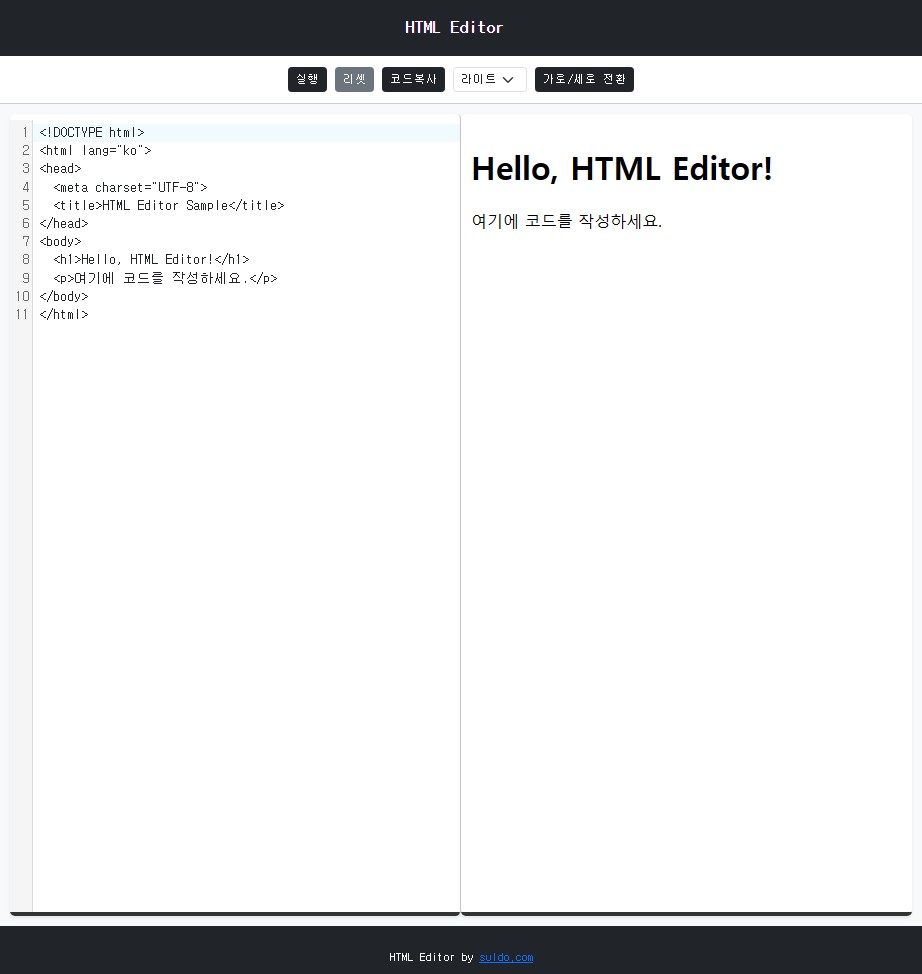 웹 개발을 하다 보면 간단히 HTML 코드를 작성하고 바로 실행해보고 싶을 때가 있습니다. 이런 상황에서 유용하게 사용할 수 있는 도구가 바로 HTML Editor by suldo.com 입니다.