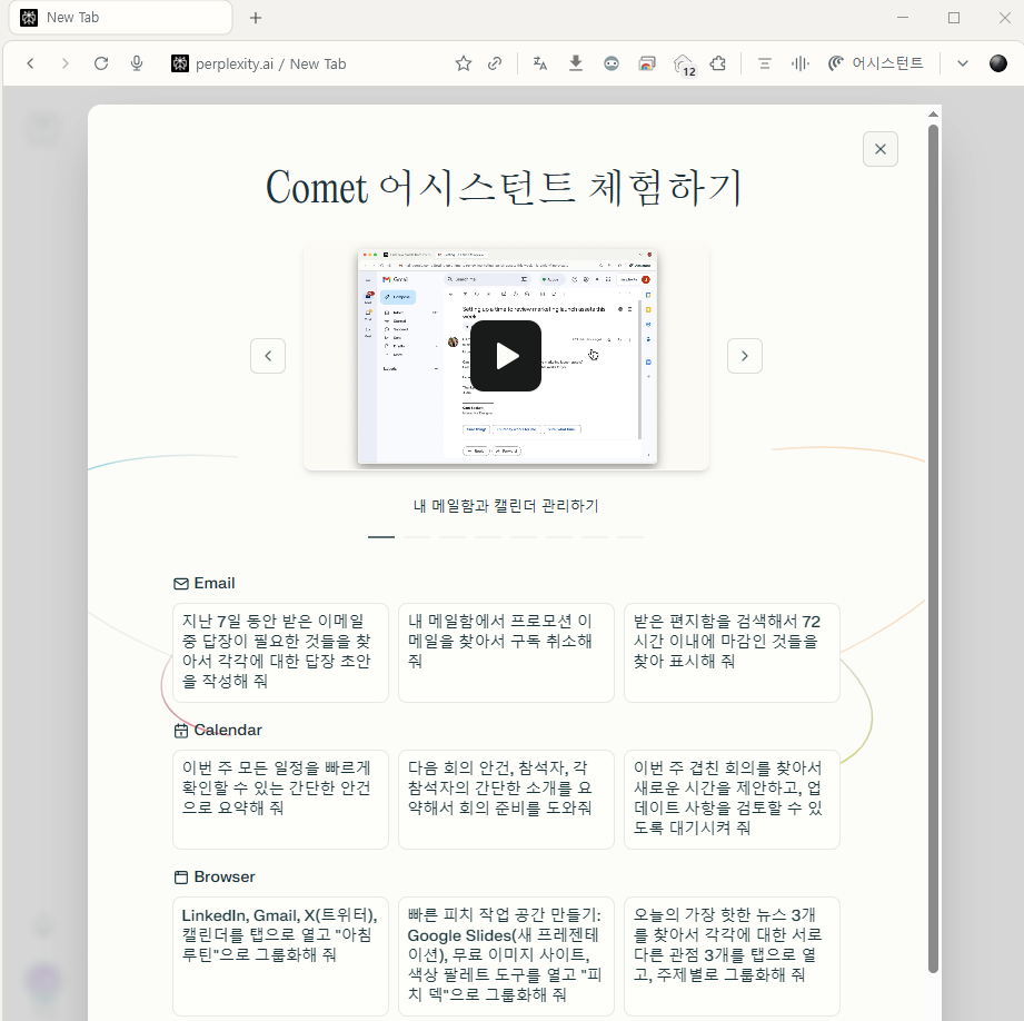 Comet 브라우저는 최신 웹 기술을 활용한 차세대 브라우저로, 빠른 속도와 안정성, 그리고 효율적인 탭 관리가 특징입니다. 주요 장점은 다음과 같습니다: